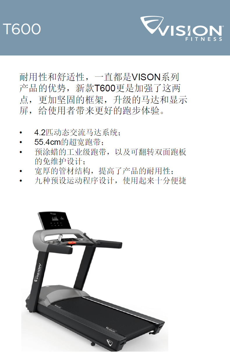 1.耐用性和舒適性,一直是VISON系列產品的優勢!新款T600更是加強了這兩點,更加堅固的框架,升級的馬達和顯示屏,給使用者帶來更好的跑步體驗